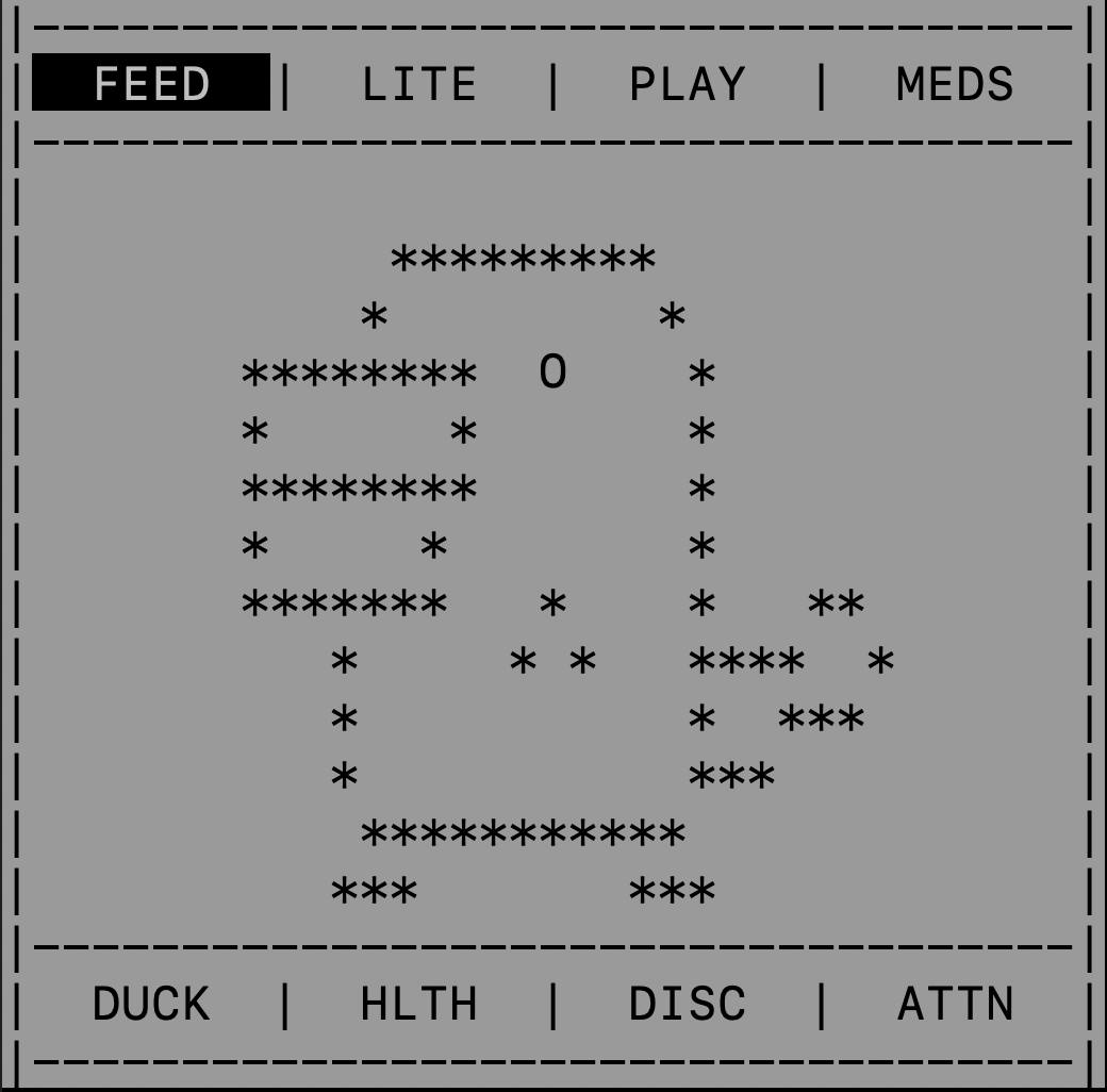A remake of the famous Tamagotchi toy, the digital pet simulator, written in C. The program utilizes the ncurses and multithreading libraries to recreate this experience. Future plans include 3D printing a case and attaching a screen and buttons to work with the program.